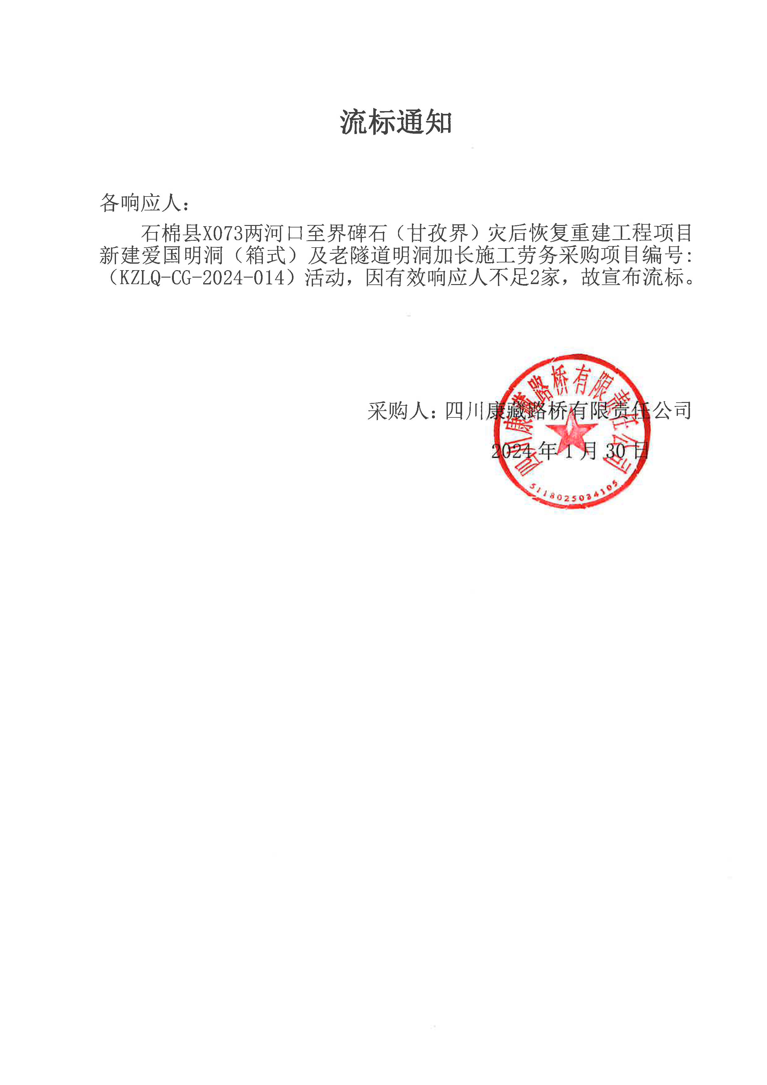 四川康藏路橋有限責任公司石棉縣X073兩河口至界碑石 (甘孜界)災后恢復重建工程項目新建愛國明洞(箱式)及老隧道明洞加長施工勞務流標通知