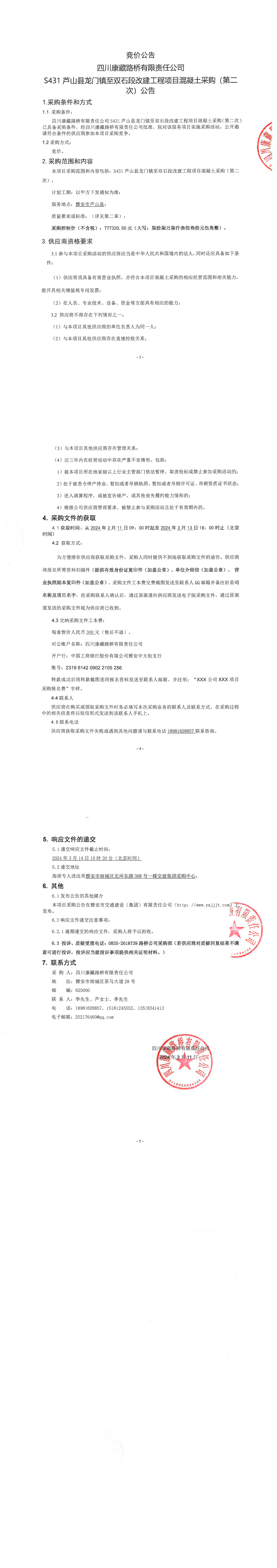 四川康藏路橋有限責(zé)任公司S431蘆山縣龍門鎮(zhèn)至雙石段改建工程項(xiàng)目混凝土采購(第二次)公告