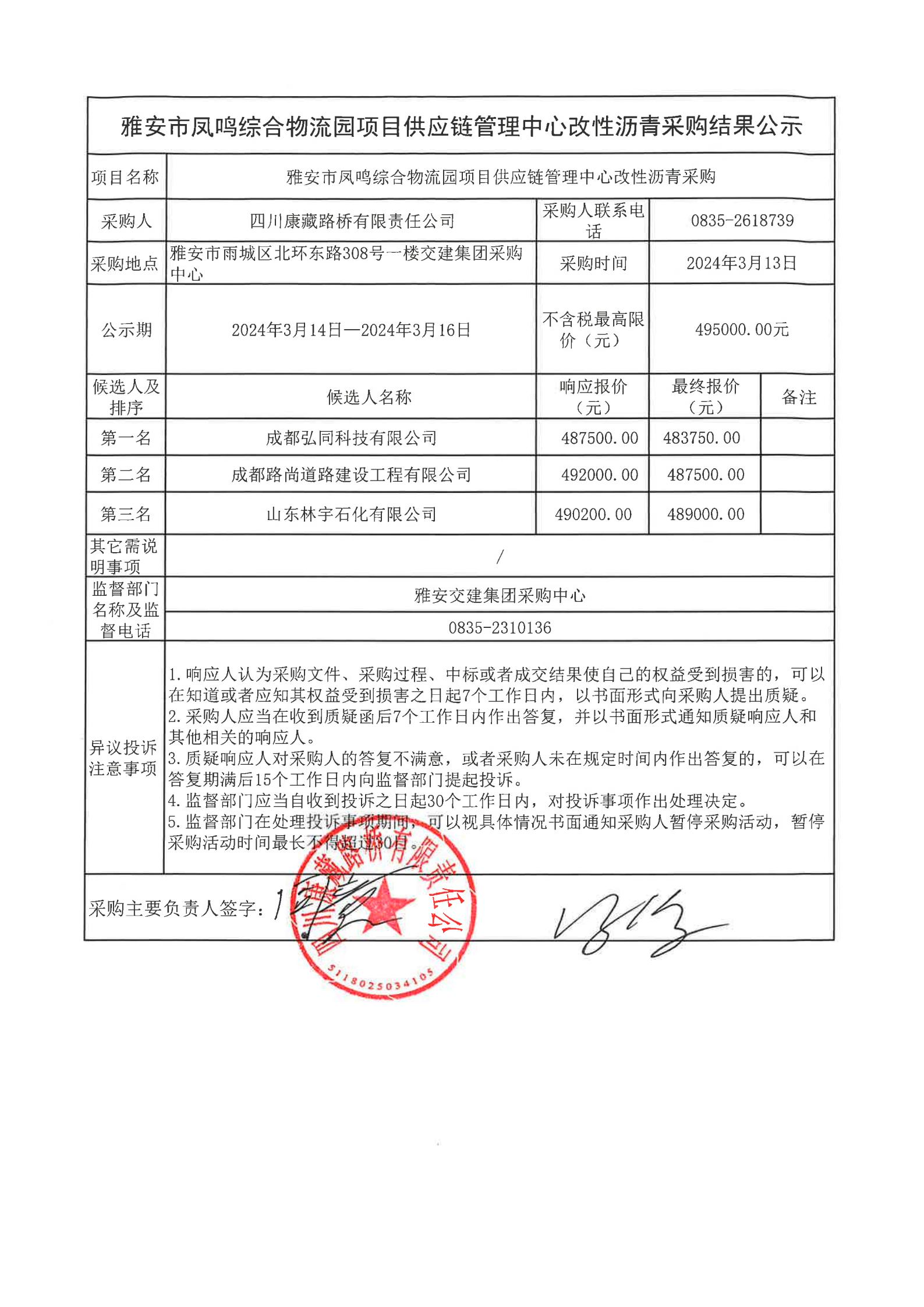 四川康藏路橋有限責(zé)任公司雅安市鳳鳴綜合物流園項目供應(yīng)鏈管理中心改性瀝青采購結(jié)果公示