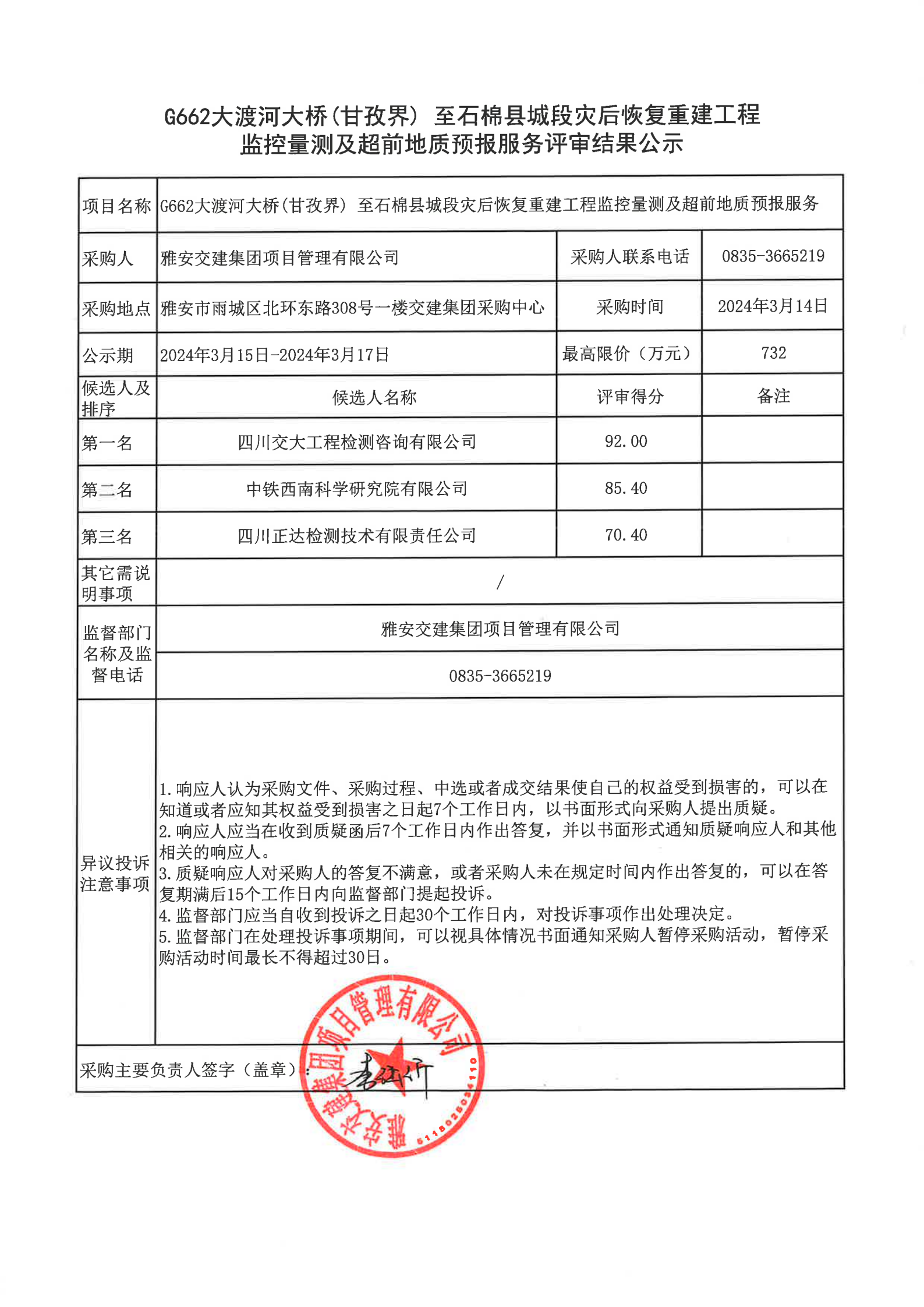 雅安交建集團項目管理有限公司G662大渡河大橋(甘孜界)至石棉縣城段災后恢復重建工程監(jiān)控量測及超前地質(zhì)預報服務評審結(jié)果公示