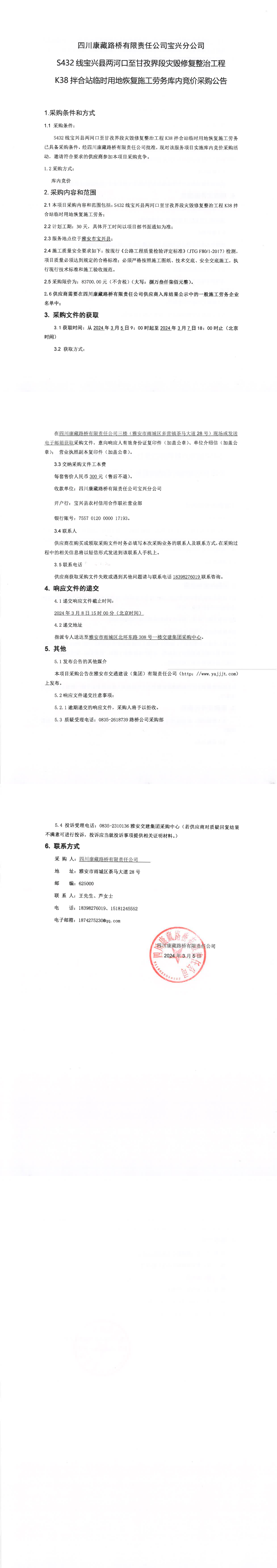 四川康藏路橋有限責(zé)任公司S432線寶興縣兩河口至甘孜界段災(zāi)毀修復(fù)整治工程K38拌合站臨時(shí)用地恢復(fù)施工勞務(wù)庫內(nèi)競(jìng)價(jià)采購(gòu)公告