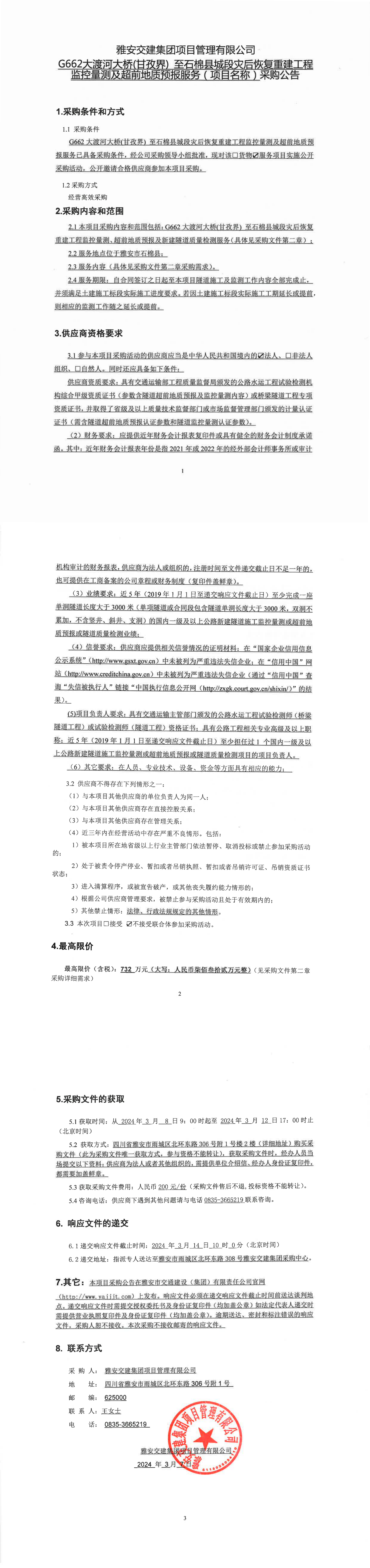 雅安交建集團項目管理有限公司G662大渡河大橋(甘孜界)至石棉縣城段災后恢復重建工程監(jiān)控量測及超前地質(zhì)預報服務(項目名稱)采購公告