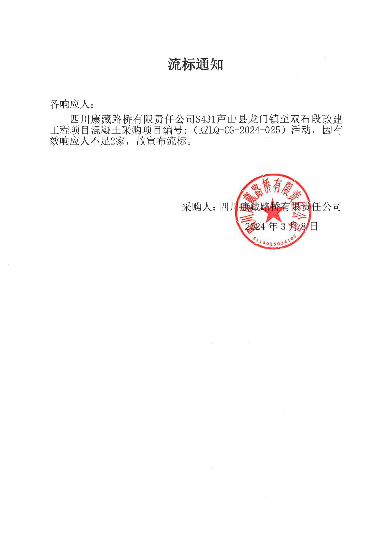 四川康藏路橋有限責(zé)任公司S431蘆山縣龍門(mén)鎮(zhèn)至雙石段改建工程項(xiàng)目混凝土采購(gòu)流標(biāo)通知