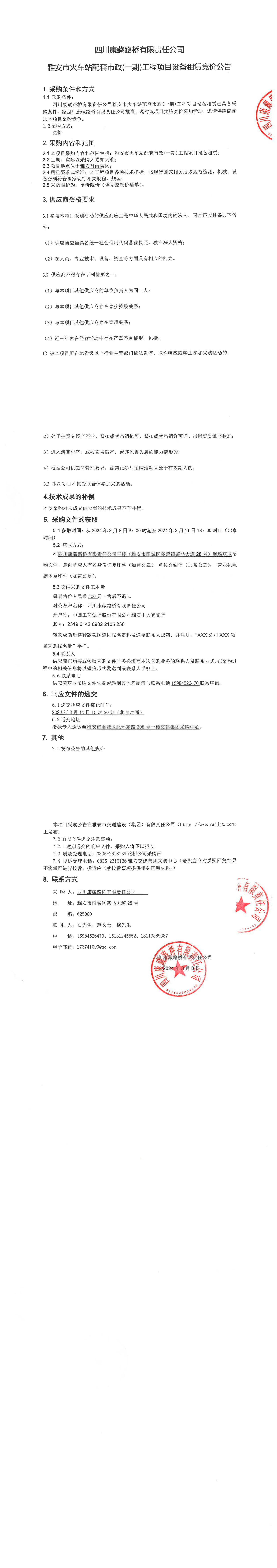 四川康藏路橋有限責(zé)任公司雅安市火車(chē)站配套市政(一期)工程項(xiàng)目設(shè)備租賃競(jìng)價(jià)公告