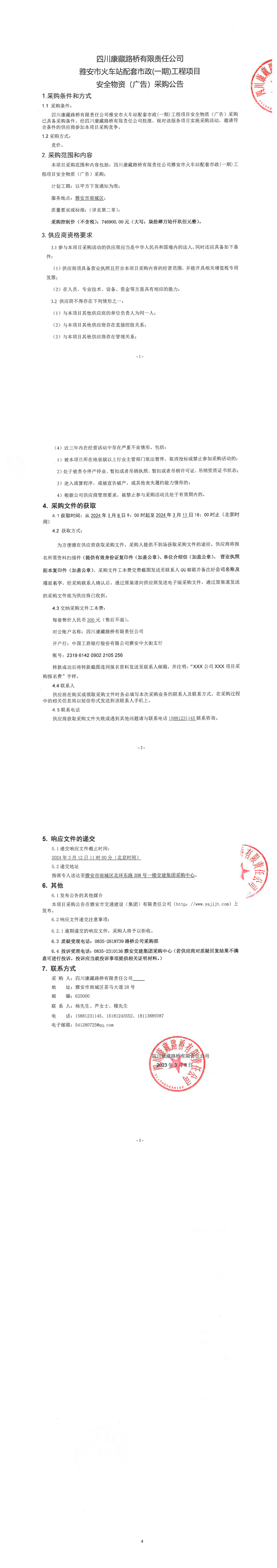 四川康藏路橋有限責任公司雅安市火車站配套市政(一期)工程項目安全物質(廣告)采購公告