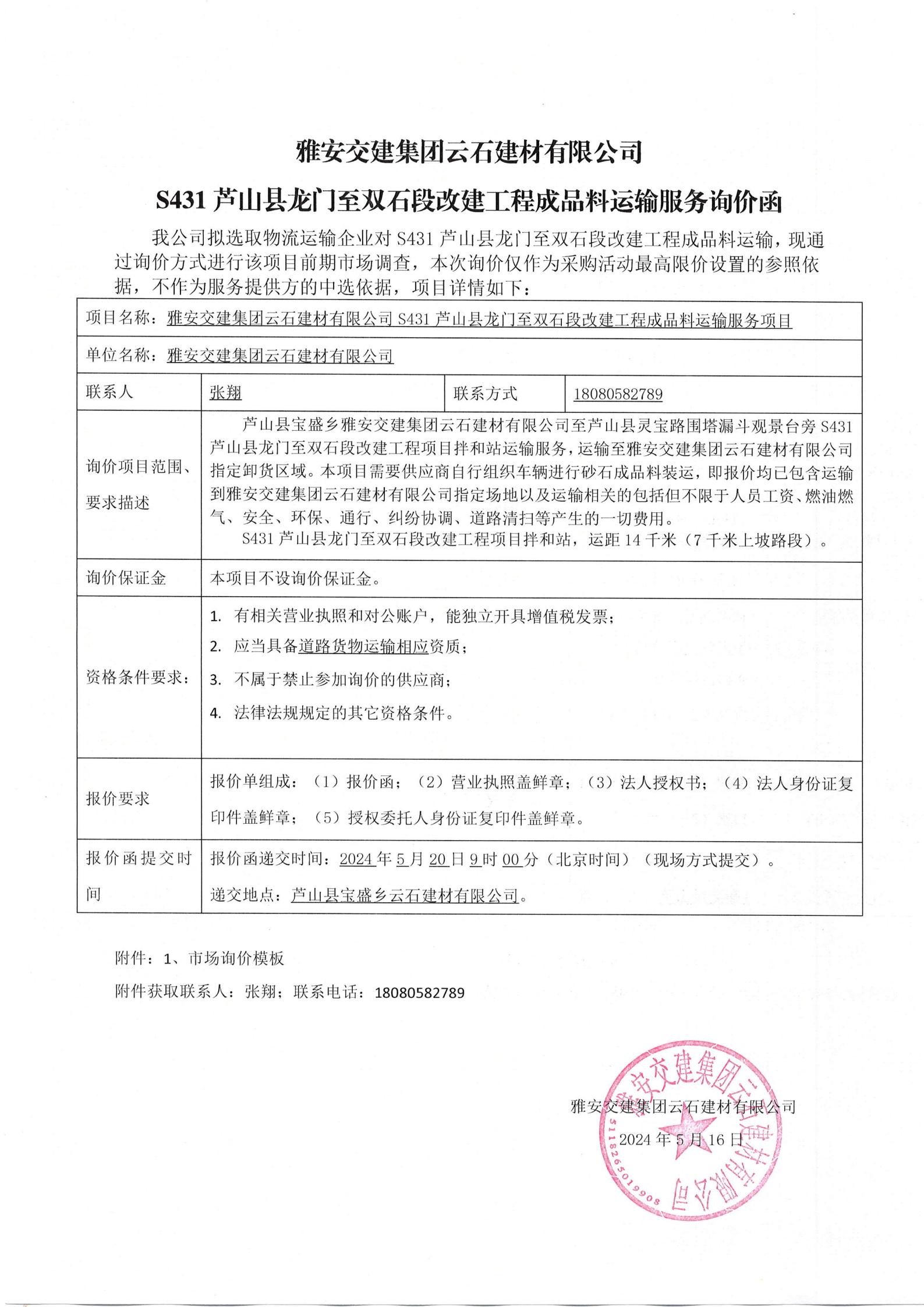 雅安交建集團(tuán)云石建材有限公司S431蘆山縣龍門至雙石段改建工程成品料運(yùn)輸服務(wù)項(xiàng)目詢價函
