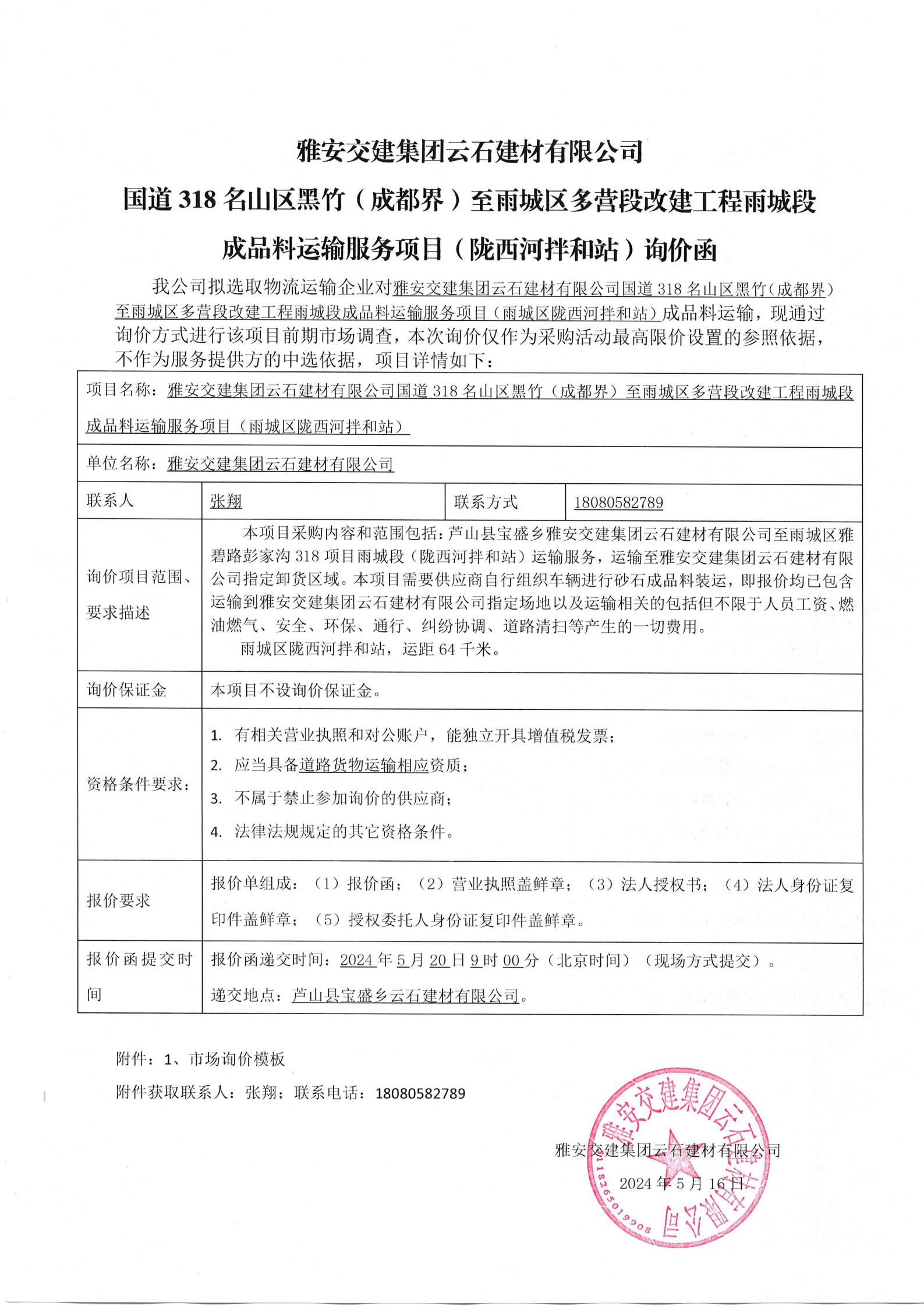 雅安交建集團(tuán)云石建材有限公司國道318名山區(qū)黑竹(成都界)至雨城區(qū)多營段改建工程雨城段成品料運輸服務(wù)項目(雨城區(qū)隴西河拌和站)詢價函