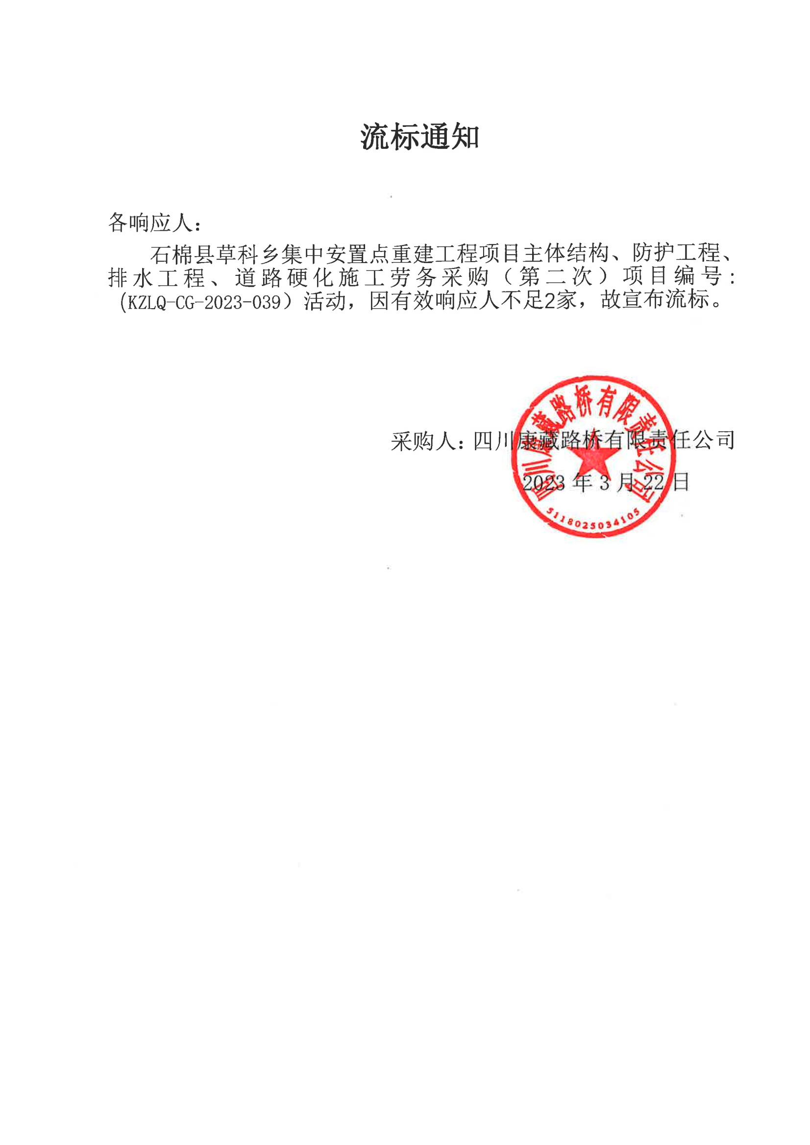 四川康藏路橋有限責任公司石棉草科鄉(xiāng)集中安置點重建工程項目主體結(jié)構、防護工程、排水工程、道路硬化施工勞務采購流標通知(第二次)