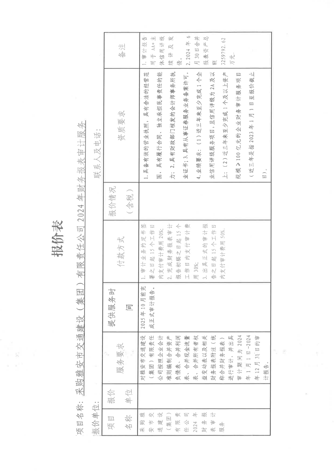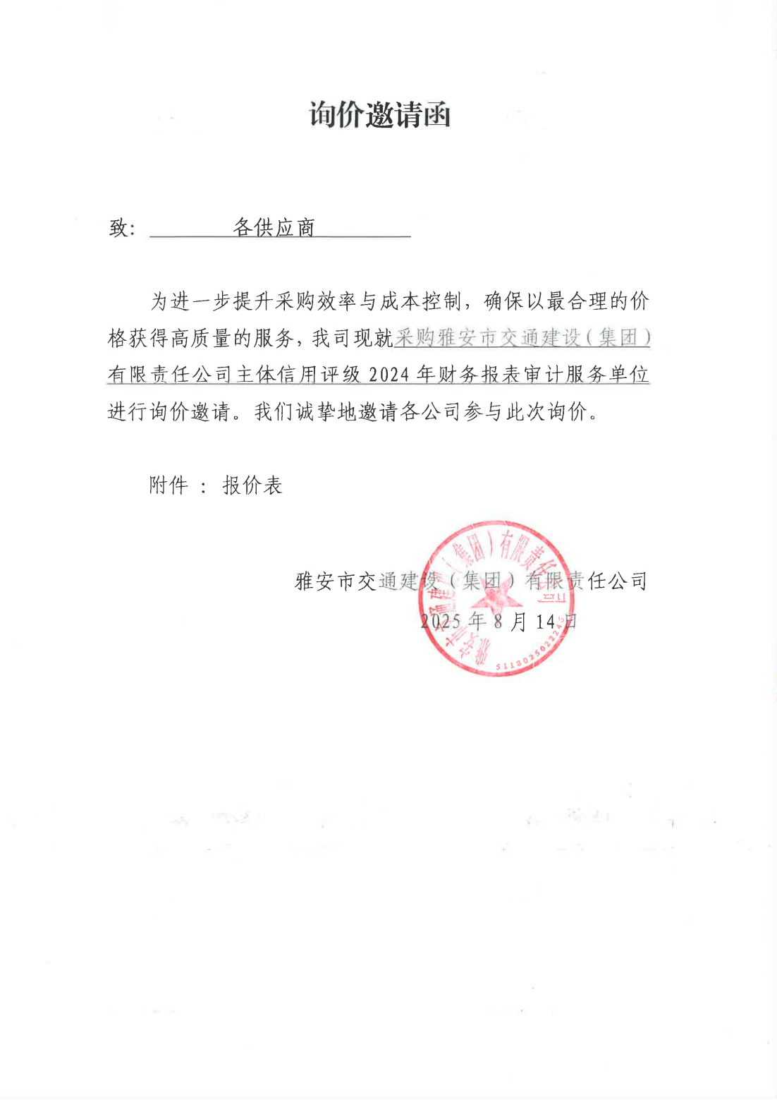 關(guān)于采購雅安市交通建設(shè)(集團)有限責任公司主體信用評級2024年財務(wù)報表審計服務(wù)單位的詢價函