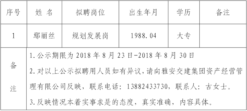 通過公開報名、資格審查、綜合測試等程序,經雅安交建集團資產經營管理有限公司研究確定以下1名擬聘用人員,現公示名單如下: