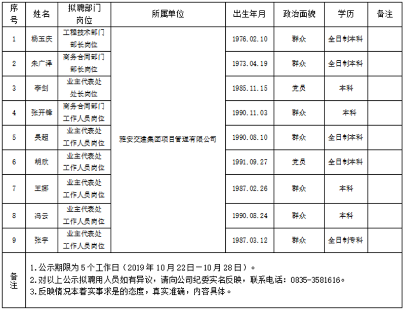 雅安交建集團(tuán)項目管理有限公司擬聘用人員公示(項目管理公司)