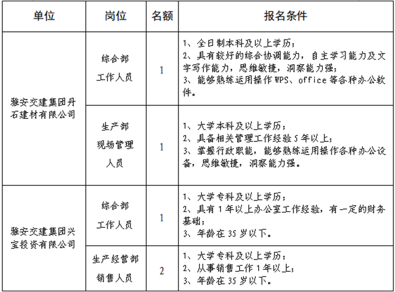 根據(jù)發(fā)展需要,決定面向社會(huì)公開招聘雅安市交通建設(shè)(集團(tuán))有限責(zé)任公司(以下簡(jiǎn)稱“雅安交建集團(tuán)”)所屬子公司工作人員5名,現(xiàn)將有關(guān)事項(xiàng)公告如下: