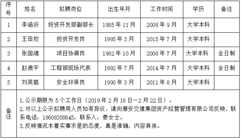雅安交建集團(tuán)資產(chǎn)經(jīng)營(yíng)管理有限公司擬聘用人員公示