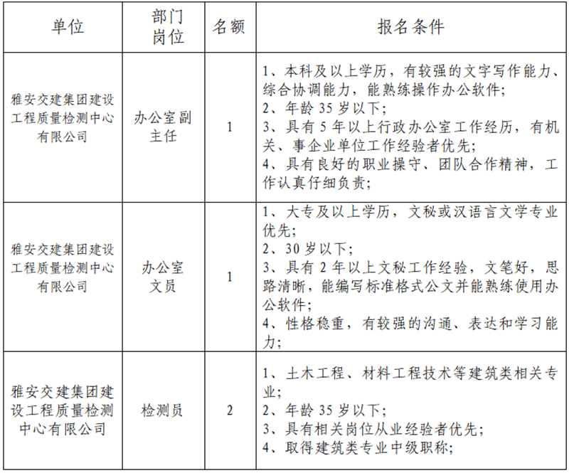 根據(jù)發(fā)展需要,決定面向社會(huì)公開招聘雅安市交通建設(shè)(集團(tuán))有限責(zé)任公司(以下簡(jiǎn)稱“雅安交建集團(tuán)”)所屬子公司工作人員4名,現(xiàn)將有關(guān)事項(xiàng)公告如下: