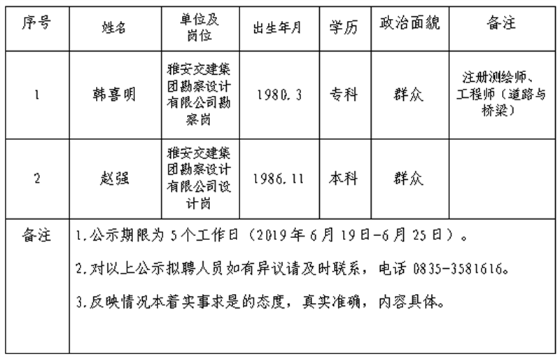 雅安交建集團(tuán)子公司擬聘用人員公示 (勘察設(shè)計(jì)公司)