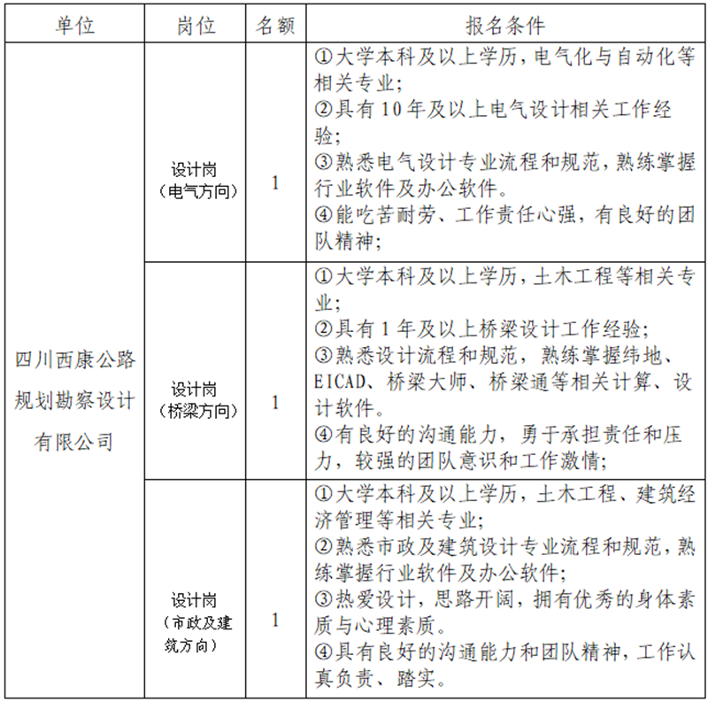根據(jù)發(fā)展需要,決定面向社會公開招聘雅安市交通建設(集團)有限責任公司(以下簡稱“雅安交建集團”)所屬子公司專業(yè)技術(shù)人才3名,現(xiàn)將有關(guān)事項公告如下: