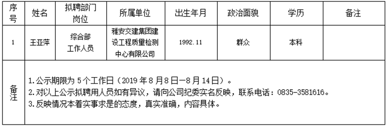 雅安交建集團子公司擬聘用人員公示(工程質(zhì)量檢測中心)