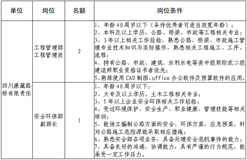 雅安交建集團(tuán)關(guān)于公開(kāi)招聘所屬子公司工作人員的公告(路橋公司)