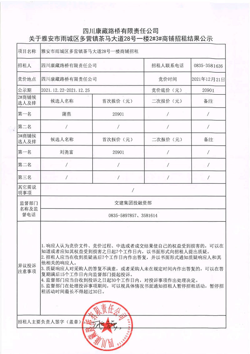 關于雅安市雨城區(qū)多營鎮(zhèn)茶馬大道28號一樓2#3#商鋪招租結(jié)果公示