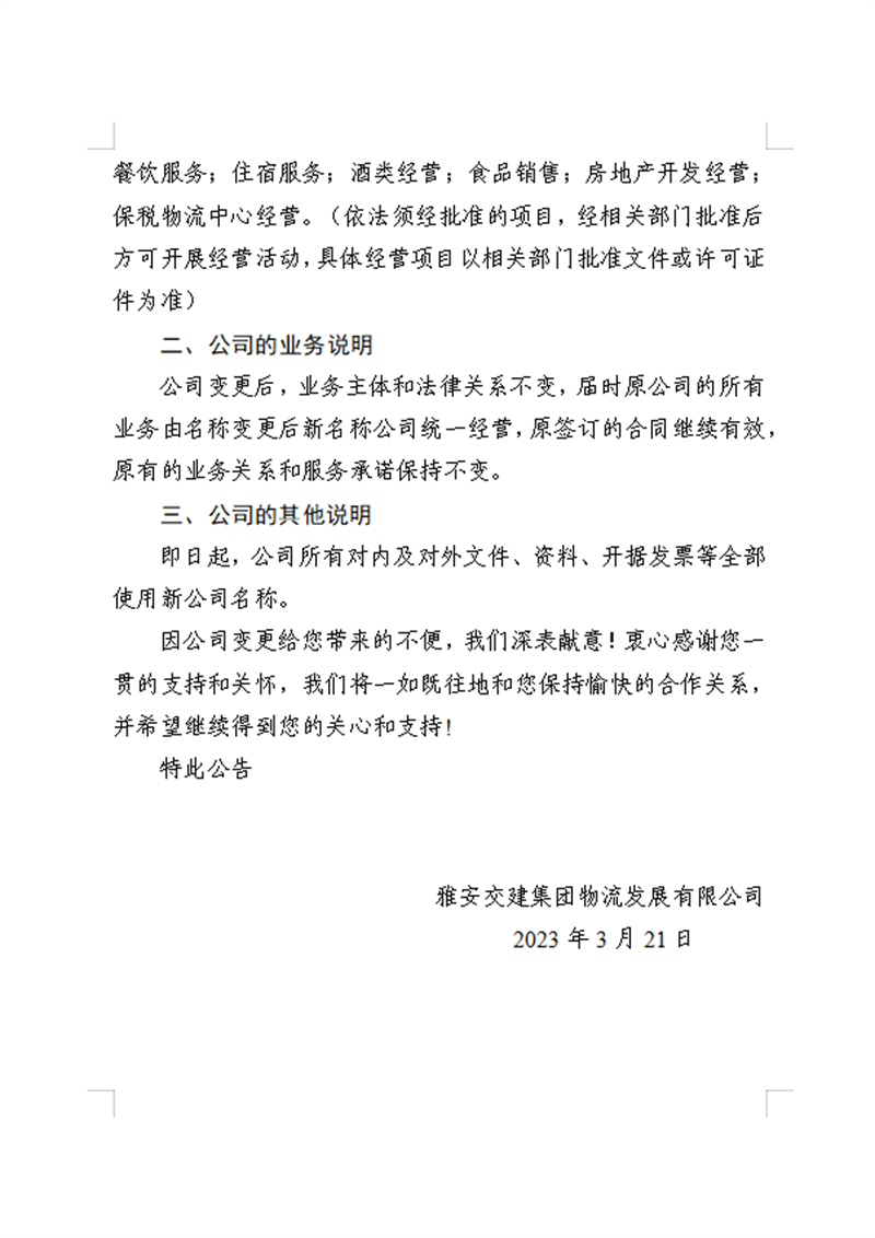 雅安交建集團(tuán)物流發(fā)展有限公司關(guān)于雅安交建集團(tuán)無水港物流有限責(zé)任公司工商變更的公告