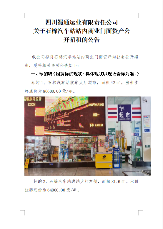 四川蜀通運業(yè)有限責(zé)任公司關(guān)于石棉汽車站站內(nèi)商業(yè)門面資產(chǎn)公開招租的公告