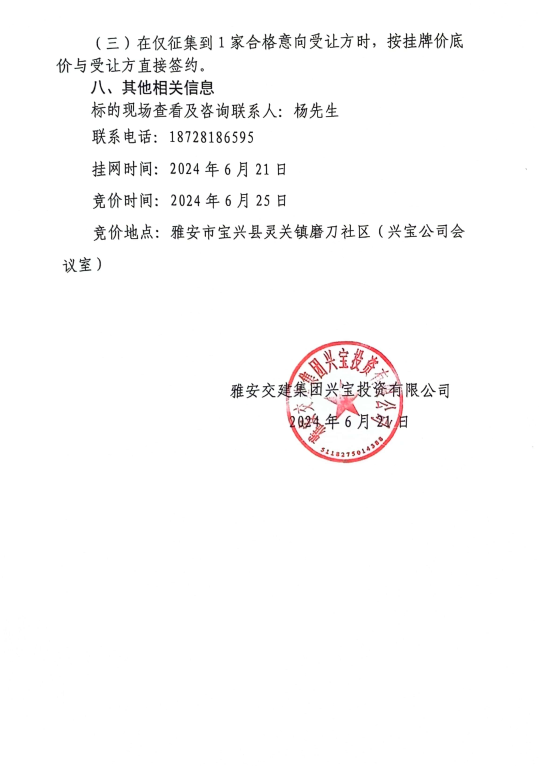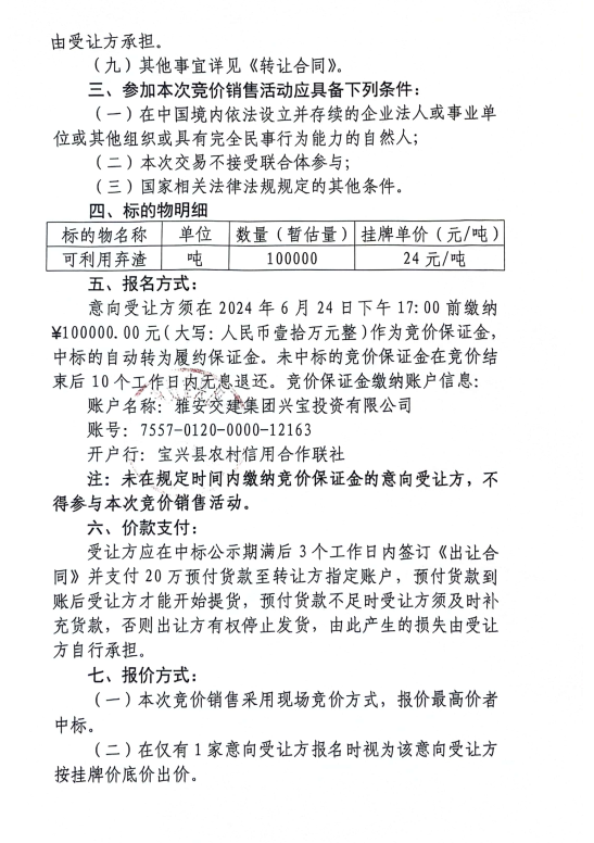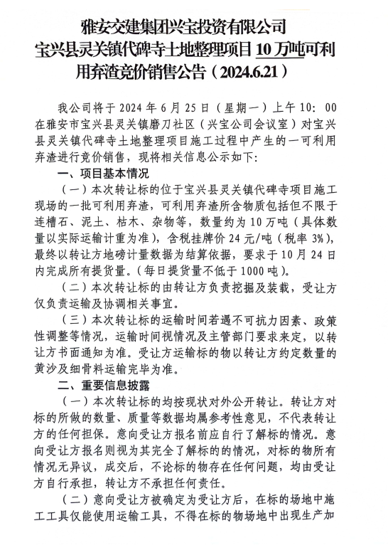 雅安交建集團(tuán)興寶投資有限公司寶興縣靈關(guān)鎮(zhèn)代碑寺土地整理項(xiàng)目10萬噸可利用棄渣競價(jià)銷售公告(2024.6.21)