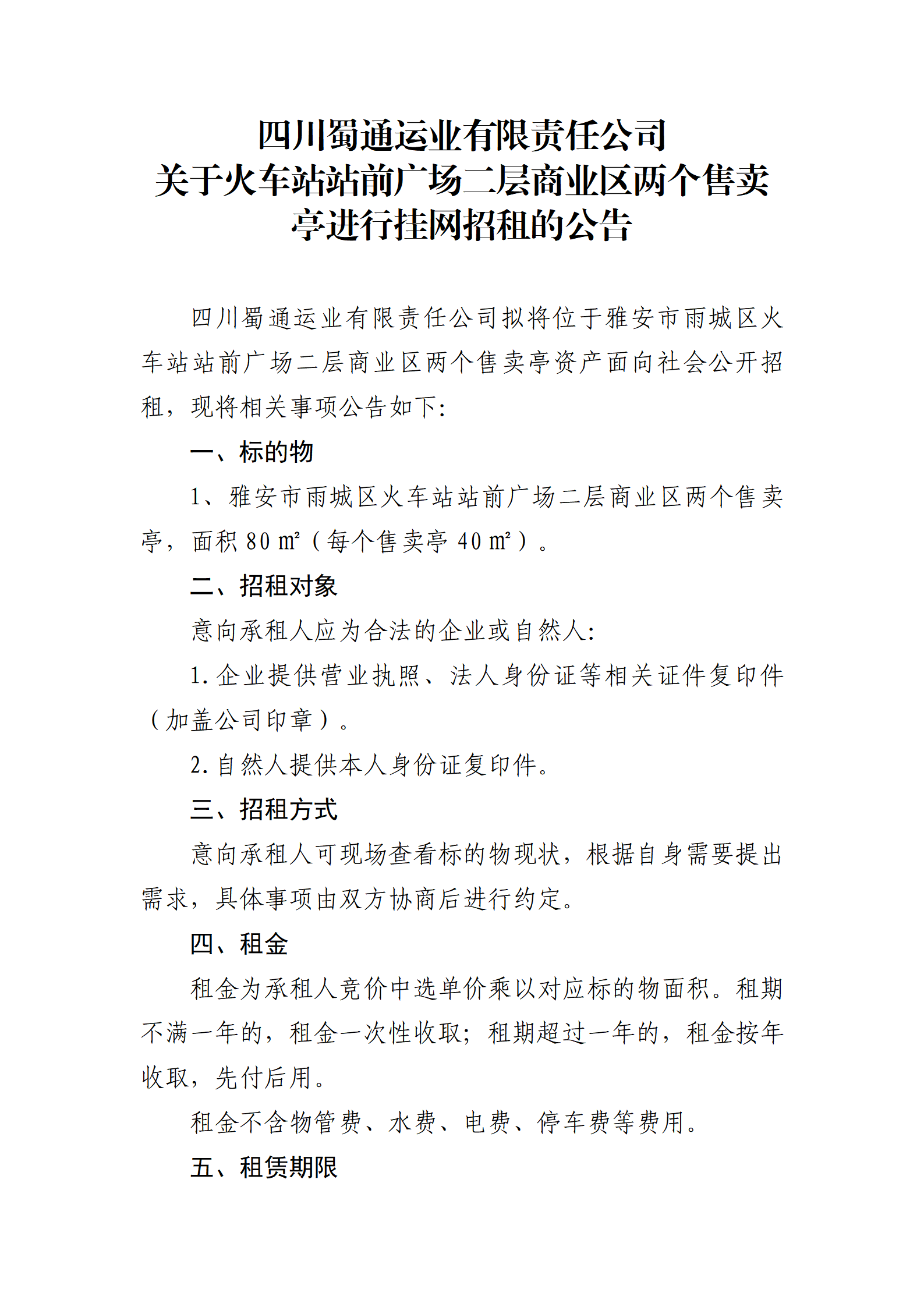四川蜀通運業(yè)有限責任公司關于火車站站前廣場二層商業(yè)區(qū)兩個售賣亭進行掛網招租的公告