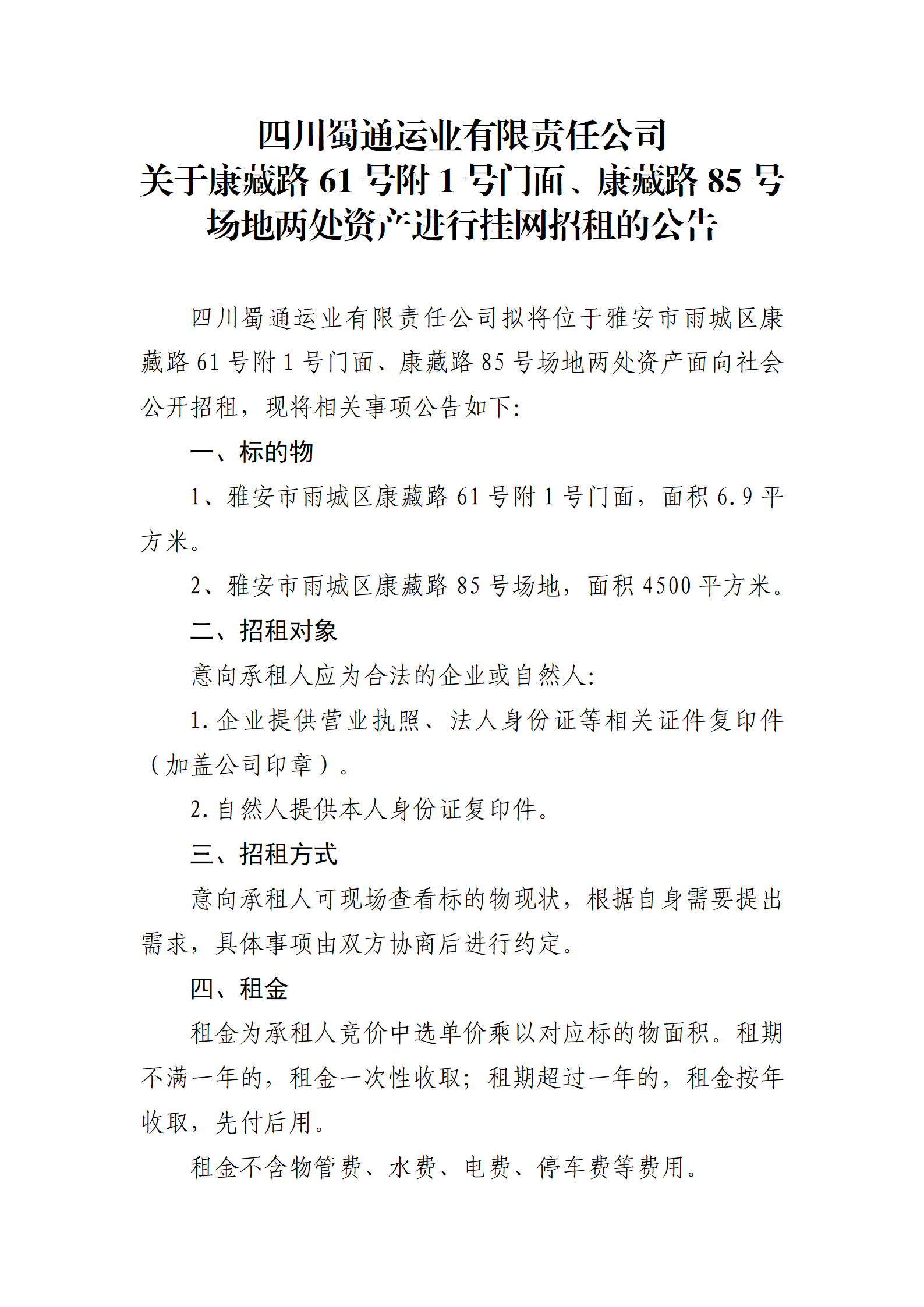ËÄ´¨Êñͨß\(y¨´n)˜I(y¨¨)ÓÐÏÞØŸ(z¨¦)Èι«Ë¾ êP(gu¨¡n)ÓÚ¿µ²ØÂ·61Ì–(h¨¤o)¸½1Ì–(h¨¤o)éTÃæ¡¢¿µ²ØÂ·85Ì–(h¨¤o)ˆö(ch¨£ng)µØƒÉÌŽÙY®a(ch¨£n)ßM(j¨¬n)ÐÐ’ì¾W(w¨£ng)ÕÐ×âµÄ¹«¸æ