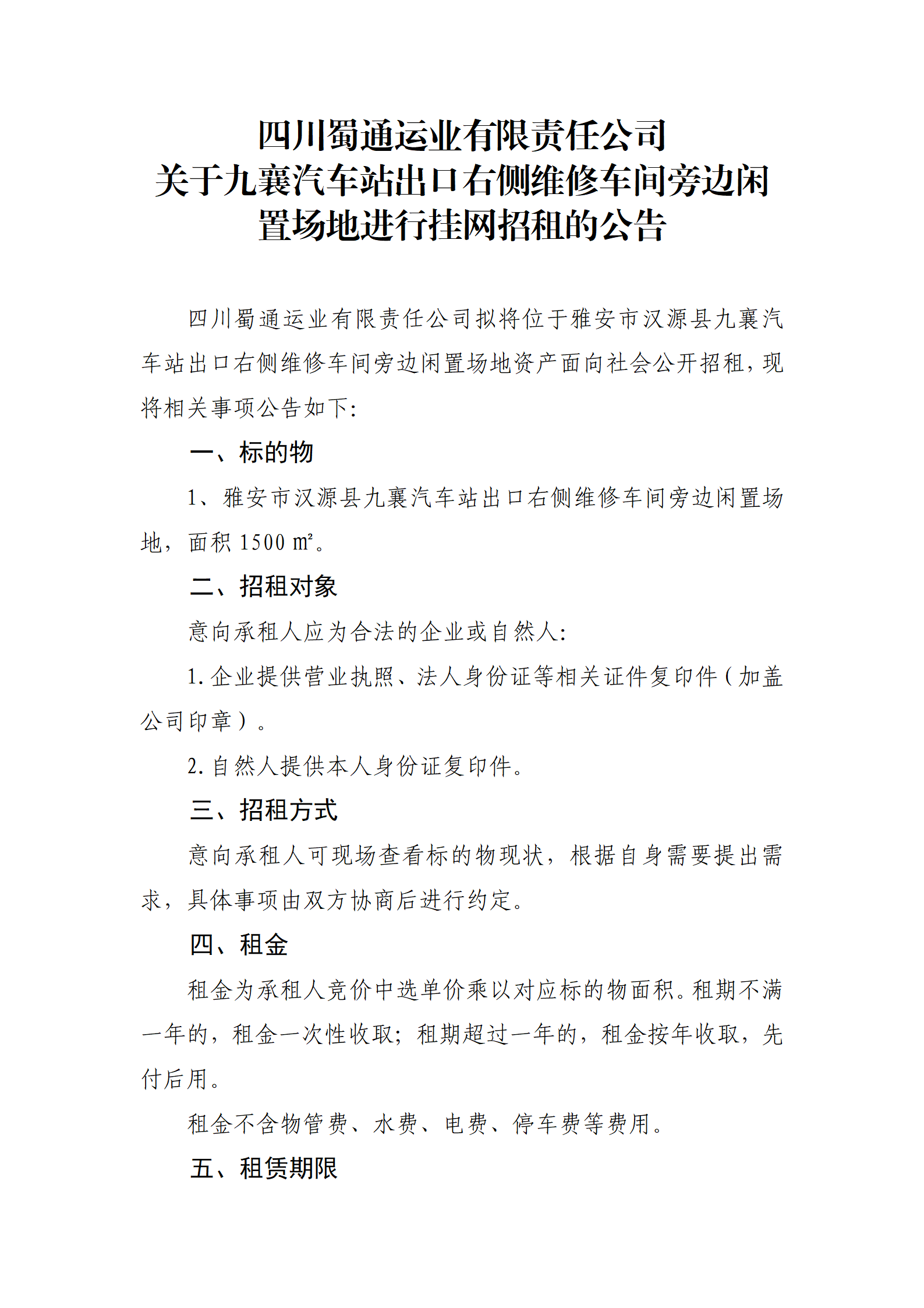 四川蜀通運業(yè)有限責(zé)任公司 關(guān)于九襄汽車站出口右側(cè)維修車間旁邊閑置場地進行掛網(wǎng)招租的公告