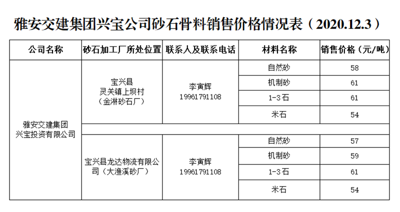 雅安交建集團興寶公司砂石骨料銷售價格情況表(2020.12.3)