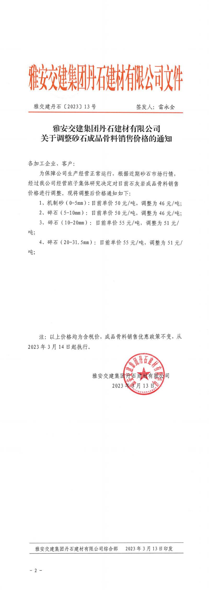 雅安交建集團(tuán)興寶投資有限公司關(guān)于調(diào)整成品料價(jià)格的通知(2023.03.13)