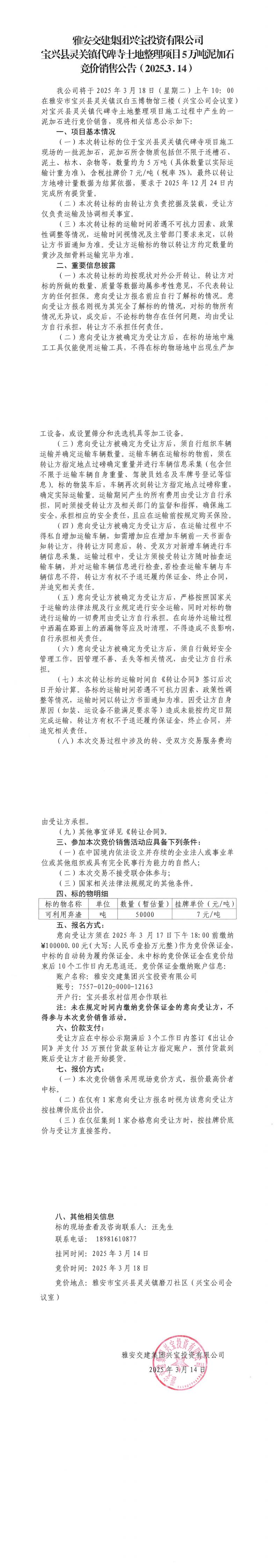 雅安交建集團(tuán)興寶投資有限公司寶興縣靈關(guān)鎮(zhèn)代碑寺土地整理項(xiàng)目5萬噸泥加石競價銷售公告(2025.03.14)